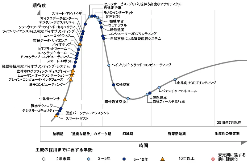 ただ、過度な期待のピークからはやはり廃れるどころか生活に根付いて実現しているものがほとんどです。そういえばテスラが自律走行車を発表したのが、ちょうど2015年あたりでしたね。