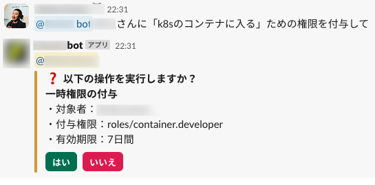 ここで承認フローが突然出てきましたが、これは自然言語でやる以上、付与対象者や付与する権限が違うものを指定されてしまう可能性があります。